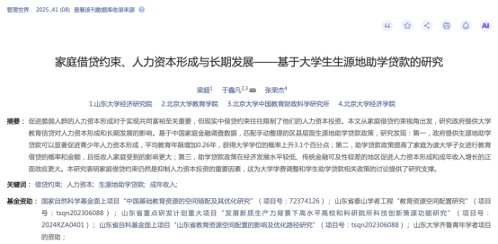 近期,我院梁超研究员、于鑫凡(我院硕士毕业生,现在北大攻读博士)与张荣杰(我院博士毕业生,现在北大从事博士后研究工作)合作的研究“家庭借贷约束、人力资本形成与长期发展——基于大学生生源地助学贷款的研究”发表在顶级期刊《管理世界》,代表着我院在制度发展与人力资本领域研究的又一突破。